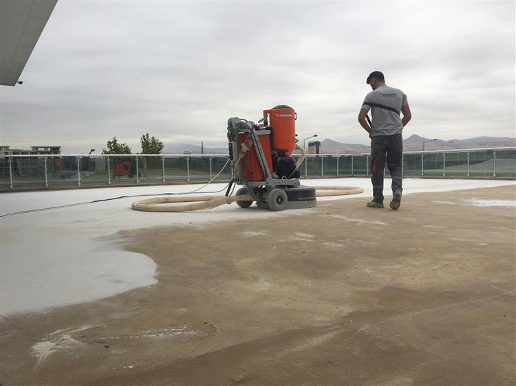 - Beton yüzey özel zımpara makineleriyle aşamalı olarak inceltilir ve pürüzsüz hale getirilir.